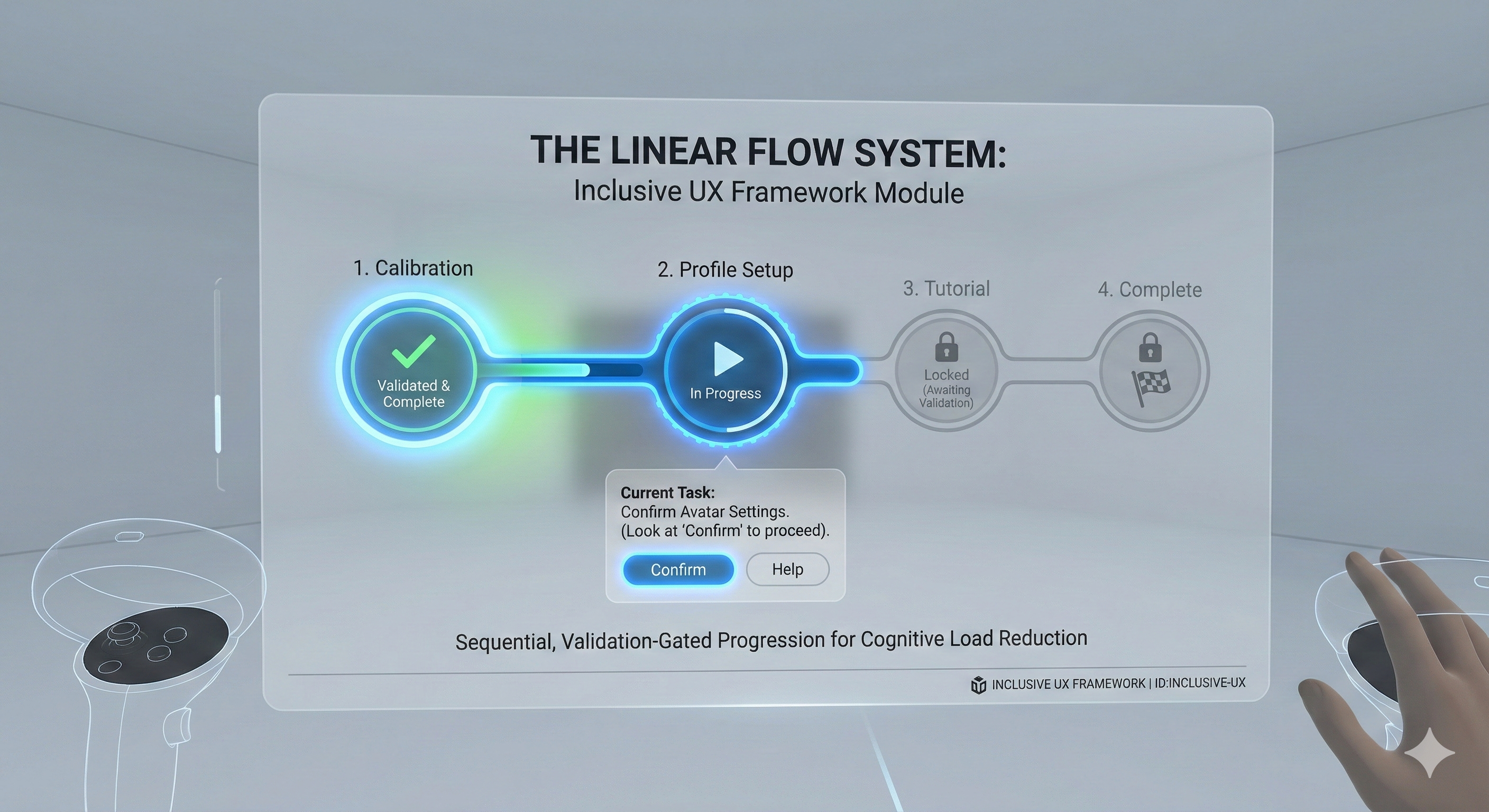 - Active Context Rendering: The detailed user interface elements (controls, text prompts, interactive objects) of the currently active step must be prominently rendered. The specific content of locked future steps should remain hidden or disabled to prevent cognitive overload, even though their corresponding nodes on the timeline are visible.