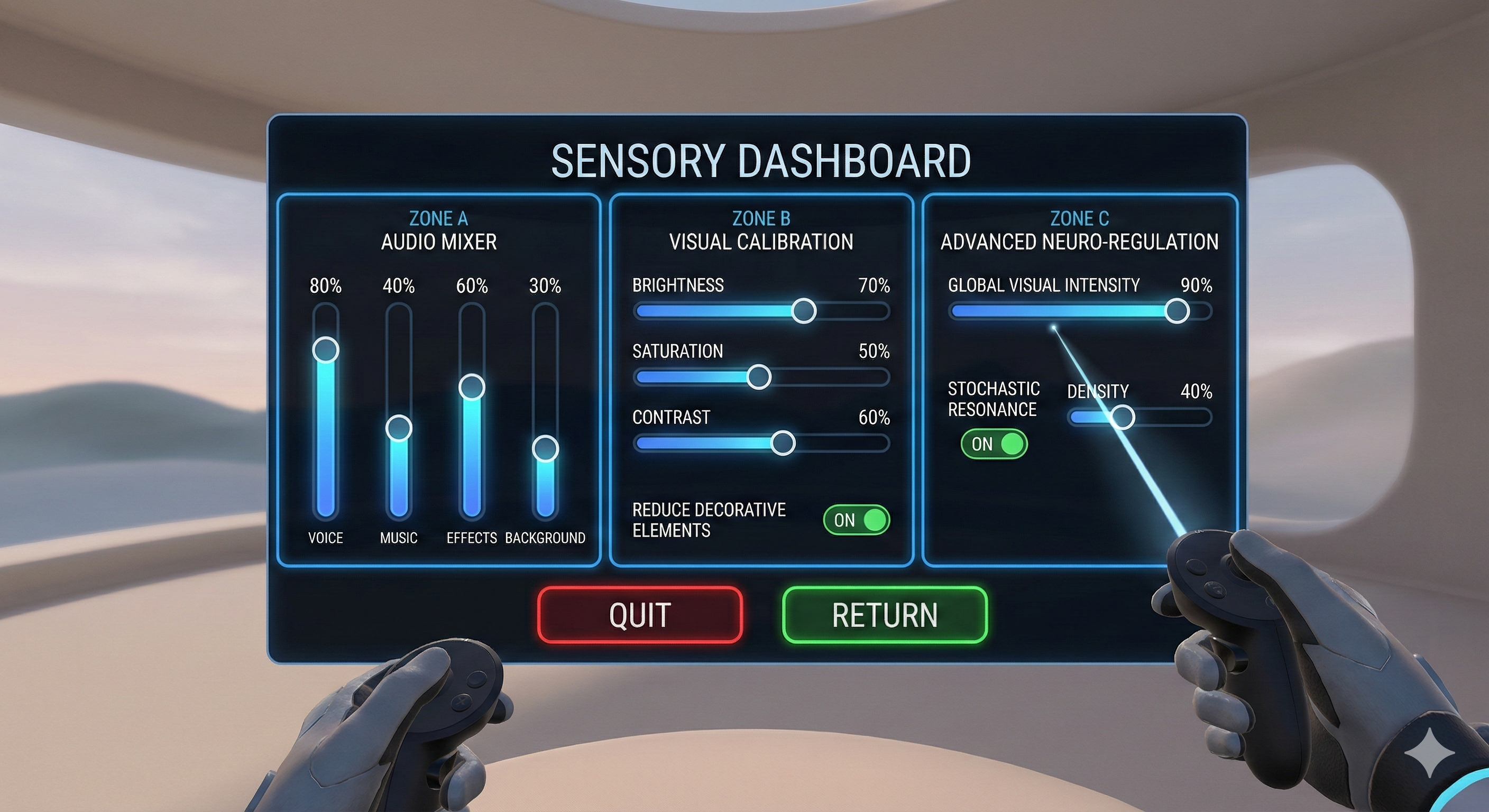 A centralised, high-fidelity configuration interface - accessible at any time - that allows the user to decouple and modulate individual sensory channels. This dashboard moves beyond simple volume control to offer deep manipulation of the rendering pipeline and audio mixing buses.