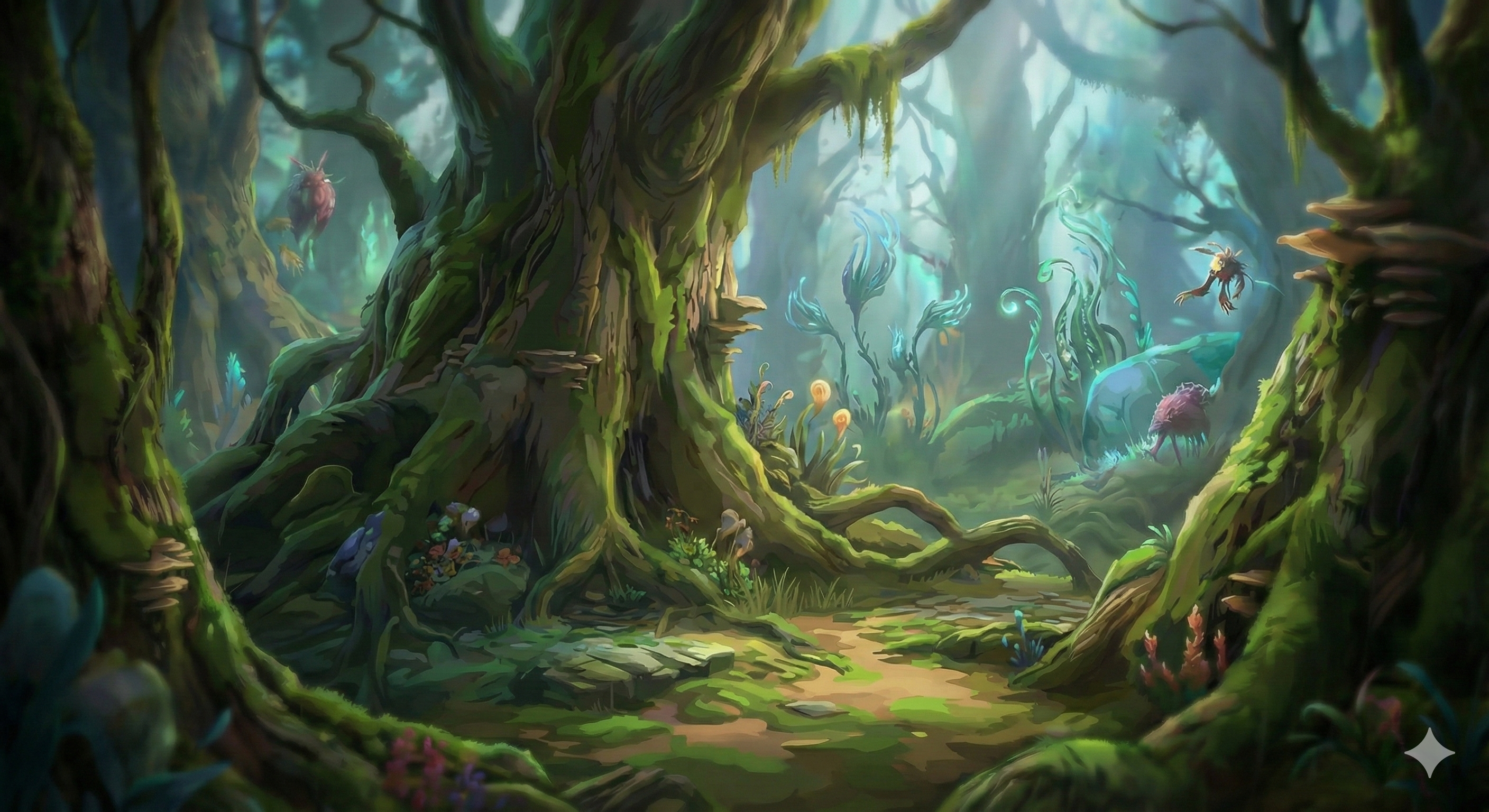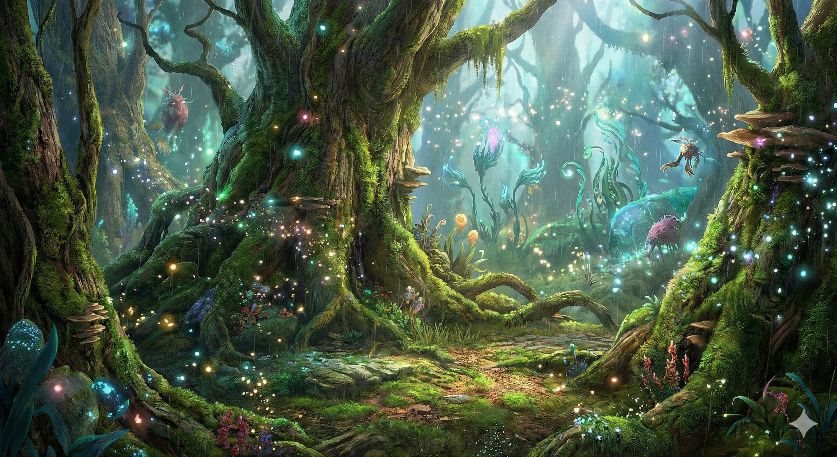 1. The Complex Environment: a typical, visually rich VR environment, featuring a high density of particle effects (glowing dust, rain), complex textures, and animated background elements, which can be overwhelming for some users.