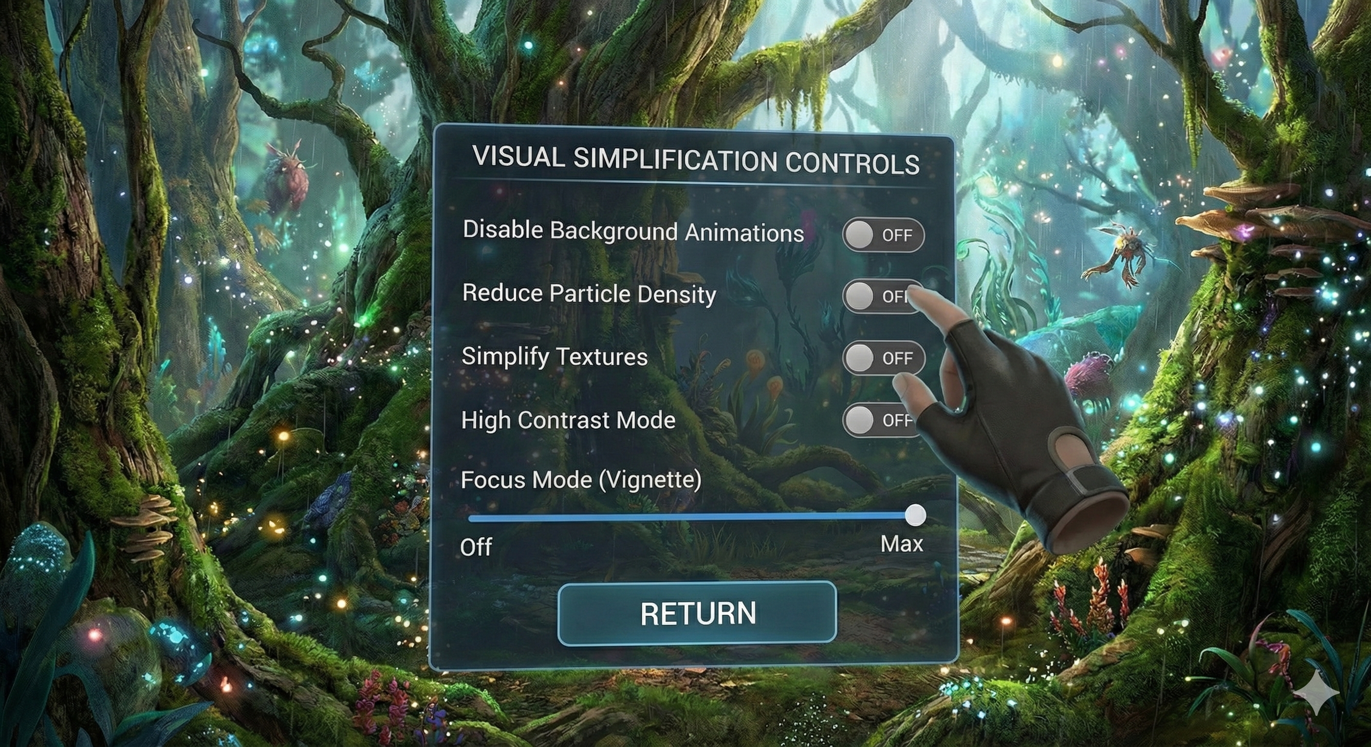 2. Visual Simplification Controls: toggles for disabling animations, reducing particle density, simplifying textures, and enabling a high-contrast mode. A slider is also available for a 'Focus Mode' (vignette).